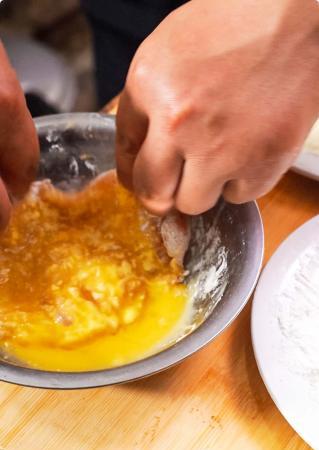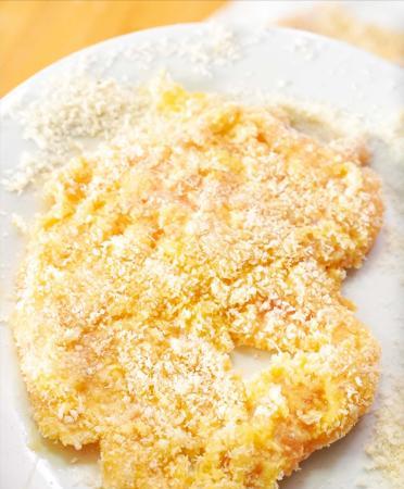 然後再放入雞蛋液中,裡外都蘸一下,然後我們讓雞排裹上一層面包糠。