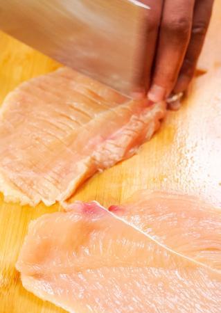 將準備好的雞胸肉洗乾淨放置案板中央,先去除筋膜和一些邊邊角角油脂,