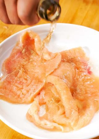 在備好的雞胸肉上面分別放入適量的鹽、味精、胡椒粉、料酒,攪拌均勻,