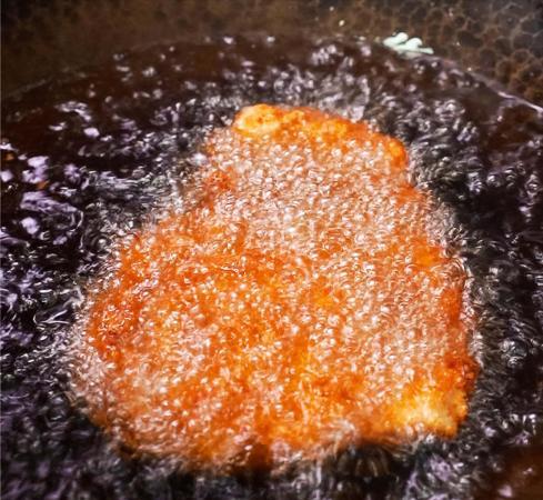 雞排炸熟炸透,一面炸至金黃翻到另一面,待兩都呈金黃色時。