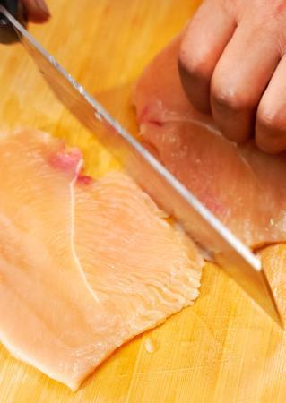 然後從中間切開,呈薄厚均勻的兩片,因為雞胸肉太厚,