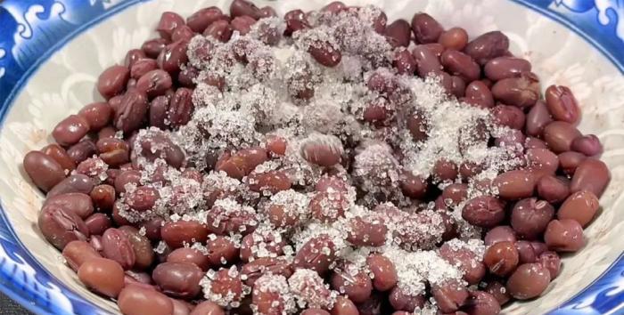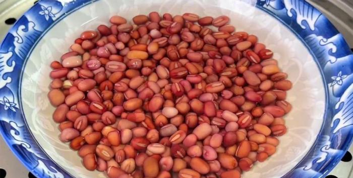 首先準備100克紅豆,洗淨後提前浸泡一晚,第二天把變大變軟的紅豆撈出來放入另一個碗中,加入沒過紅豆的清水,冷水上鍋,中火蒸25分鐘。