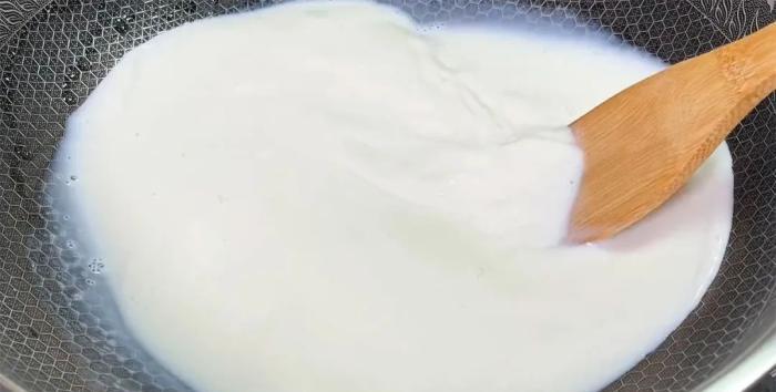 把攪拌均勻的牛奶澱粉倒入鍋中,開小火慢慢的加熱,加熱過程中要用鏟子不停的攪拌,這樣可以防止粘鍋。
