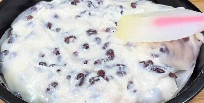 準備一個模具或者盤子,底下鋪一層油紙防粘,家中沒有油紙也可以刷一層薄薄的食用油,然後把紅豆牛奶糊糊倒進去,這個糊糊非常的黏,可以在鏟子上沾一點清水,把表面抹平整一點,這樣定型後更好看。