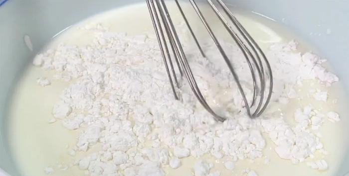攪勻以後再加入60克玉米澱粉,沒有玉米澱粉用土豆澱粉、小麥澱粉都可以,把澱粉和牛奶攪拌均勻,讓它們充分融合在一起。